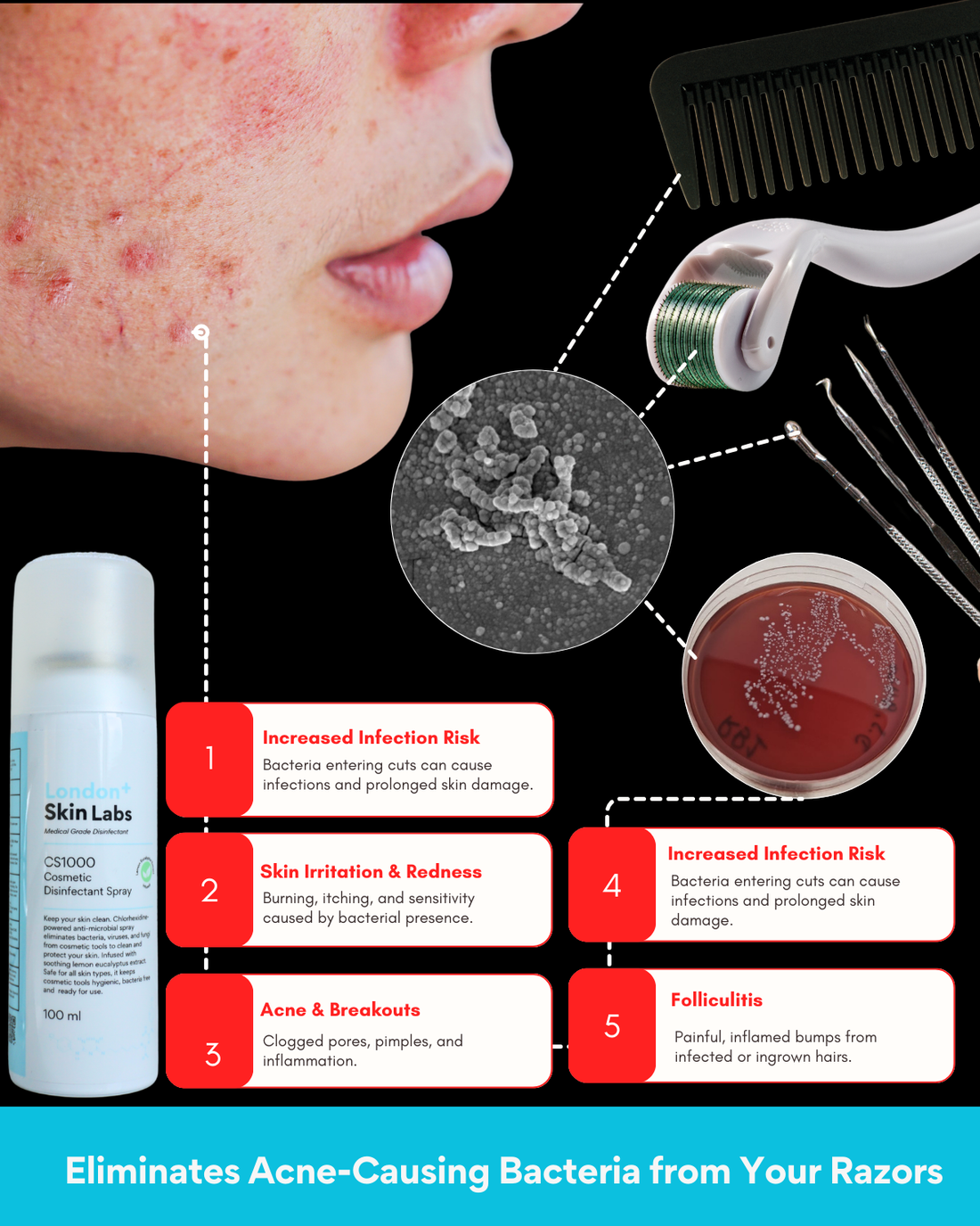 Our premium disinfectant sprays are specially made for razors, clippers, combs, and beauty tools. Powered by Medical-grade Chlorhexidine, they kill 99.9% of bacteria, fungi, and viruses helping prevent acne breakouts, irritation, and infections. Whether you're shaving, styling, or grooming, make sure your tools stay as clean as your skin deserves.