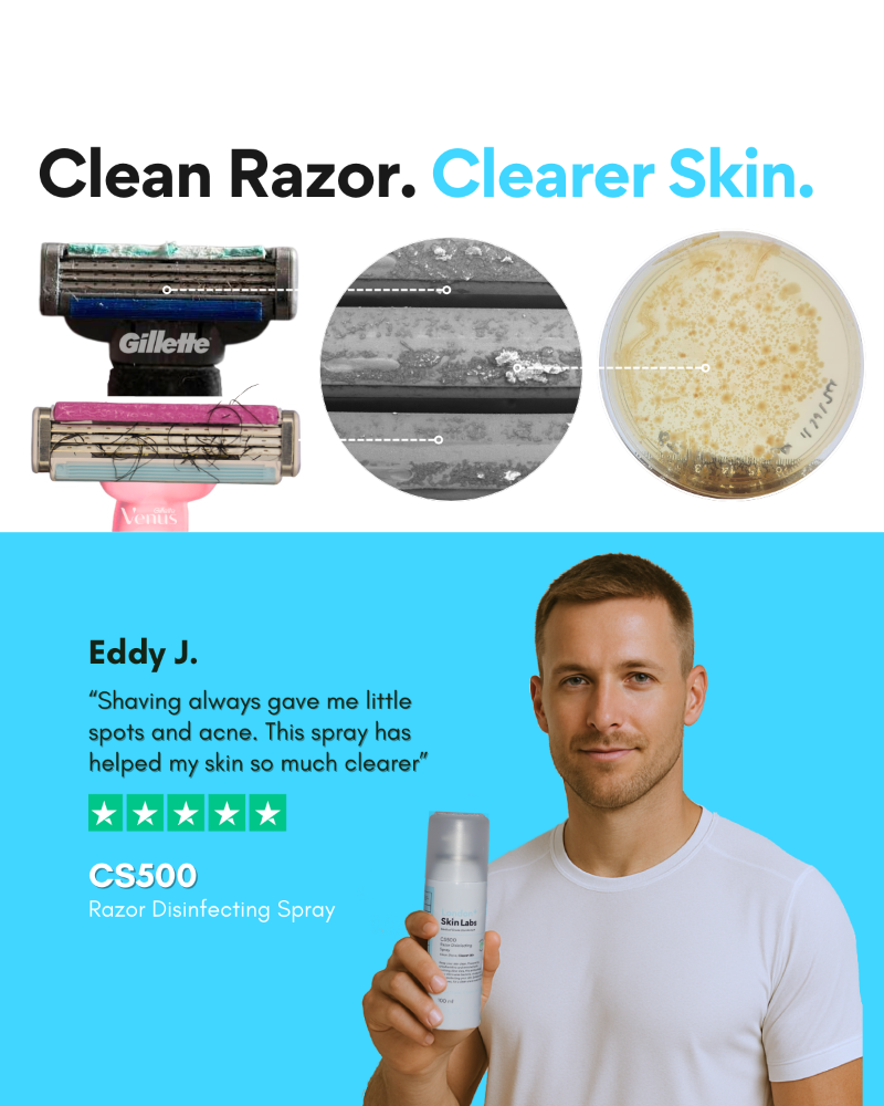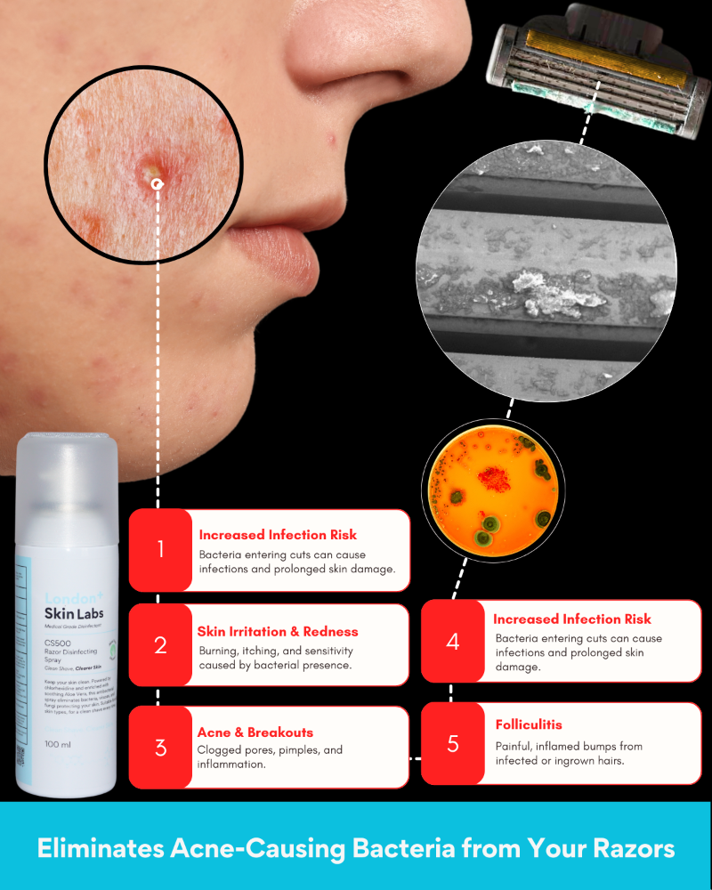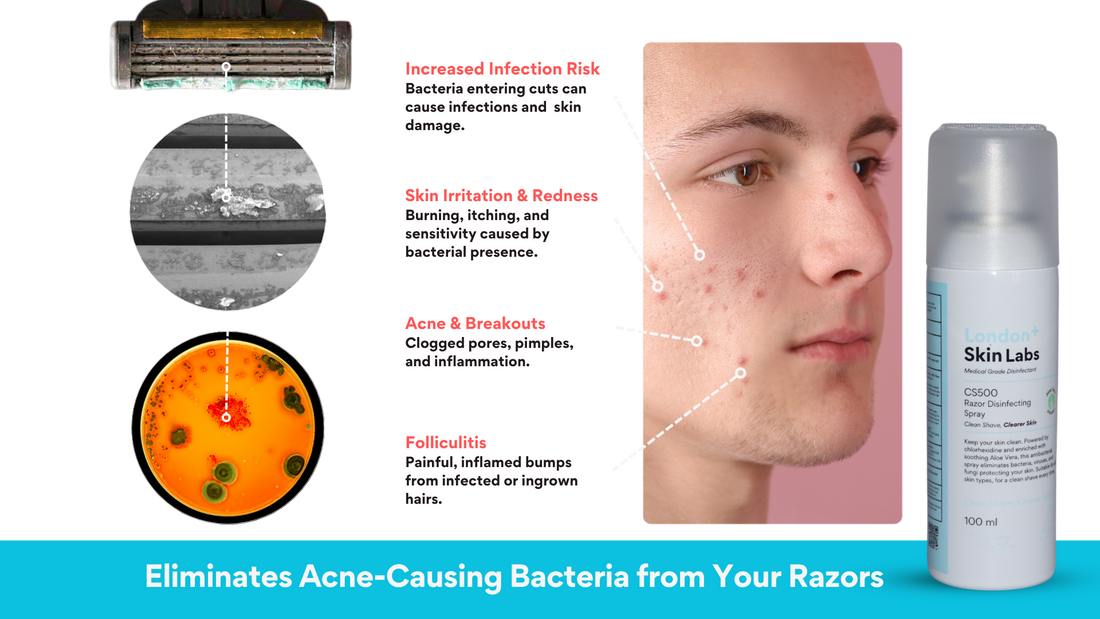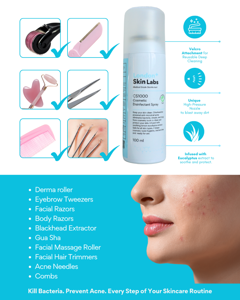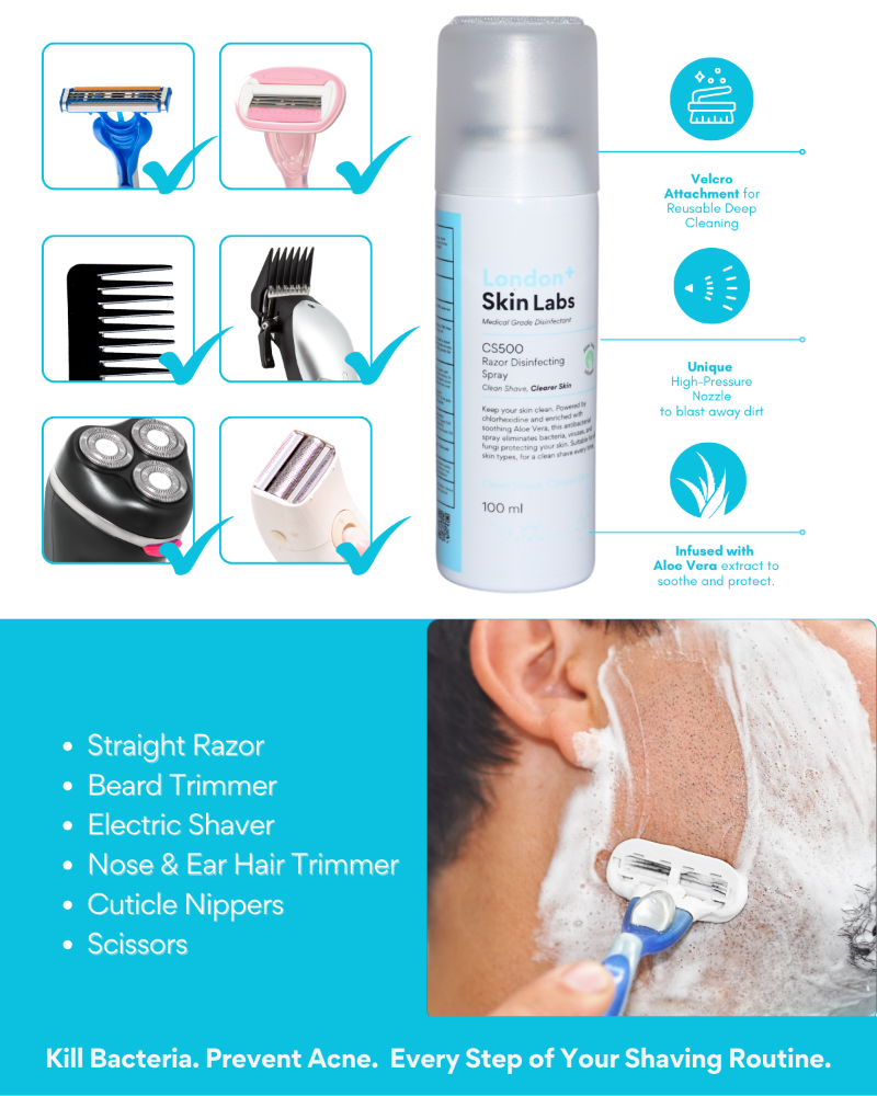 Our premium disinfectant sprays are specially made for razors, clippers, combs, and beauty tools. Powered by Medical grade Chlorhexidine, they kill 99.9% of bacteria, fungi, and viruses helping prevent acne breakouts, irritation, and infections. Whether you're shaving, styling, or grooming, make sure your tools stay as clean as your skin deserves.